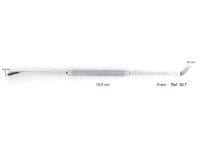 Распатор Freer 30-7 длиной 18,5 см – специализированный инструмент, применяемый в стоматологической хирургии для отделения надкостницы и хрящей. Имеет заточенные клиновидные кромки и рабочие части шириной 6,0 и 6,5 мм.